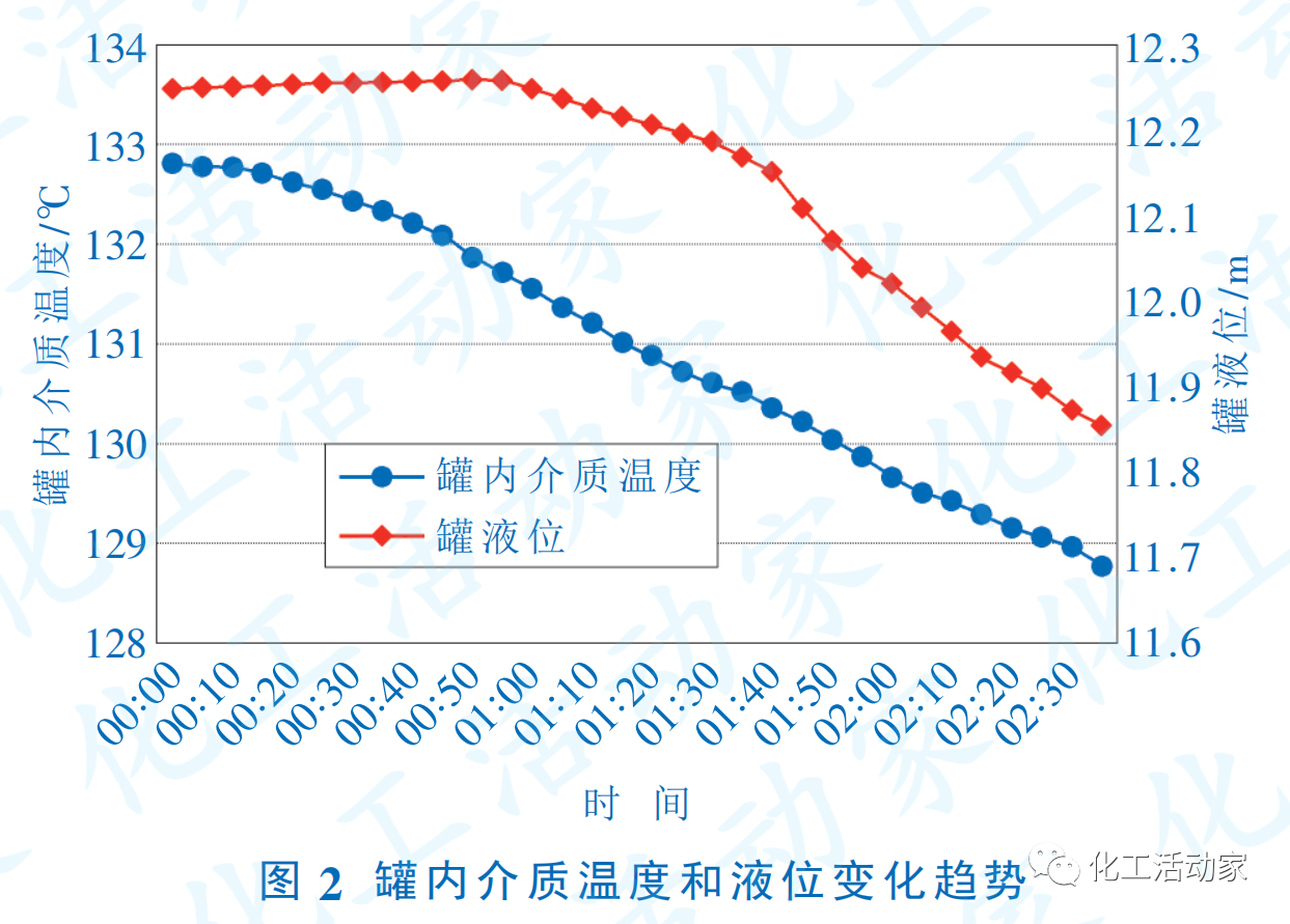 从图2中事故前后罐内介质的温度逐步下降也可看出,水汽化吸收热量,因此可以基本确定,罐超压的原因是液态水汽化。