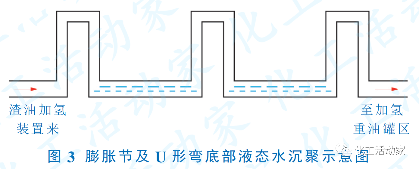 分析加氢重油从装置到罐区的管道设计和现场布置,为了节省空间,从装置到罐区沿途的11个膨胀节全部设计成垂直抬高的U形弯,而非水平弯。由于密度差和重力作用,液态水会在U形弯的底部沉聚和富集,膨胀节的U形弯和液态水聚集示意图如图3所示。