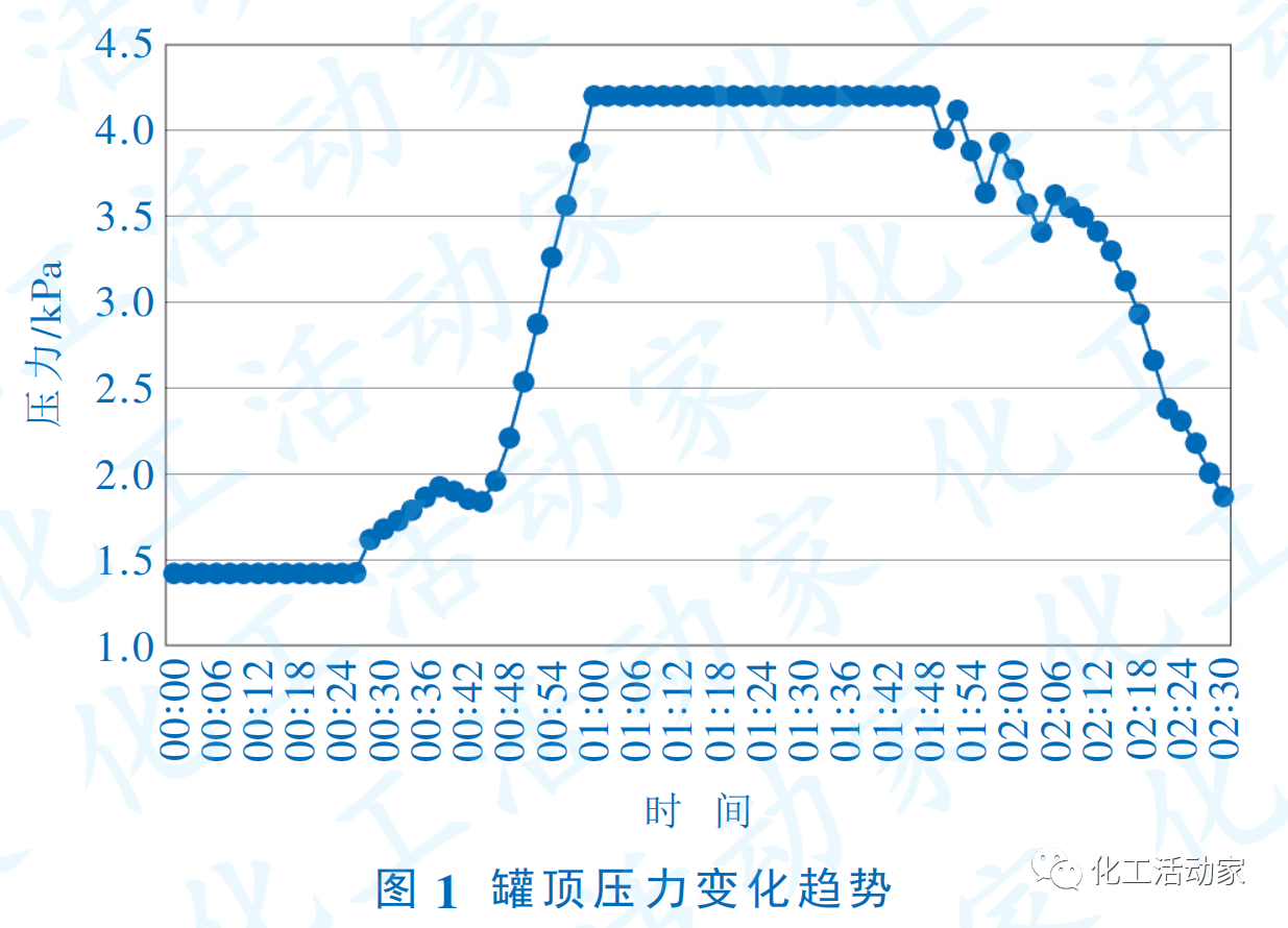 因压力表量程只有4.2kPa,罐体撕裂时的准确压力值无法得知,对图1中压力曲线的快速上升段作延长线,延长至罐撕裂的时间点01:29,再横向与纵坐标对齐,推测罐体撕裂时的压力值为11kPa。从图2可见,事故发生前后,罐内液位和温度缓慢下降但未大幅波动。