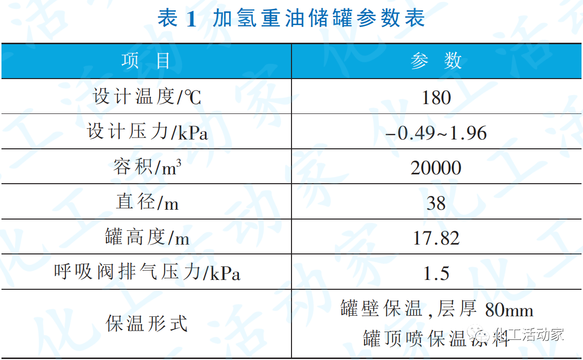 加氢重油储罐是4.8Mt/a催化裂化装置的原料罐,储存介质为上游4.0Mt/a固定床渣油加氢装置送出的加氢后重油,于2017年9月投入使用。加氢重油罐的结构形式为立式拱顶常压罐,罐顶设氮封和呼吸阀,储罐的相关参数见表1。