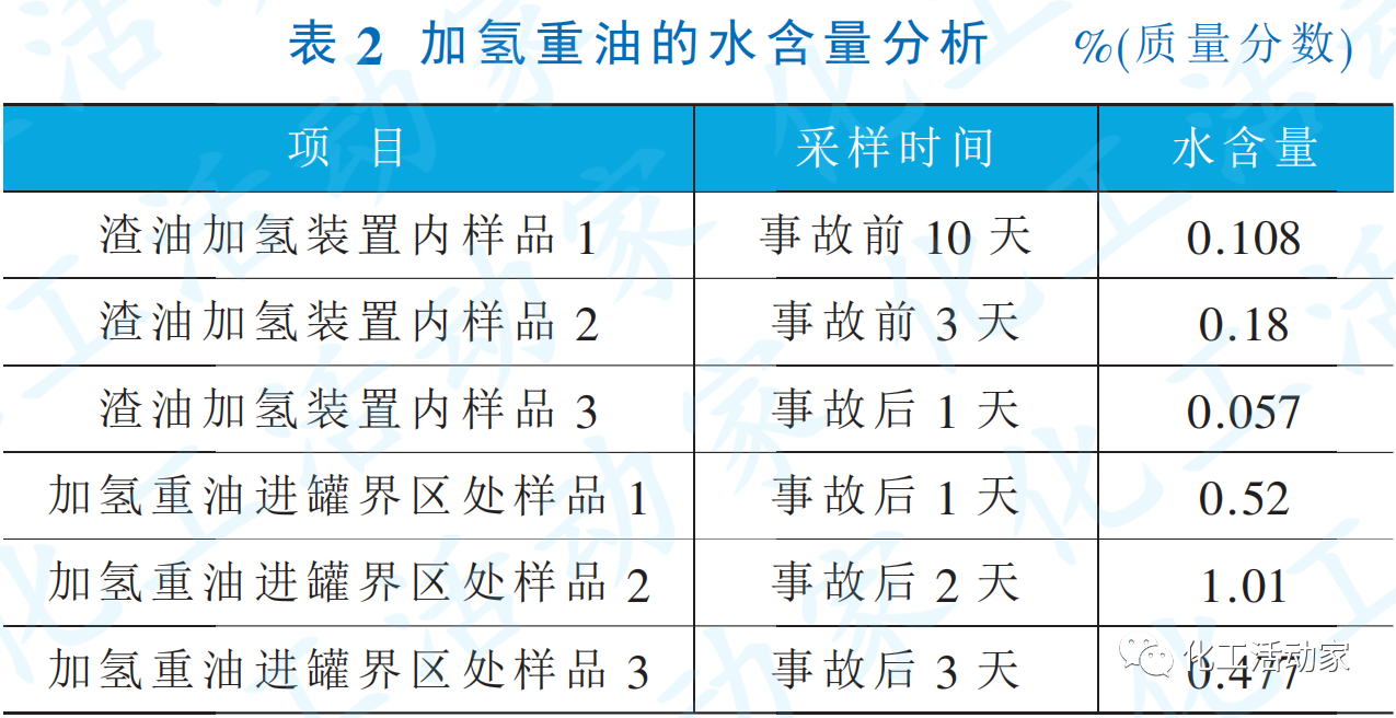 从表2可知,事故前加氢重油的水含量最高时已达0.18%,是设计值的5倍还多。