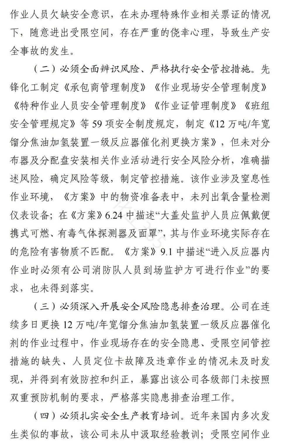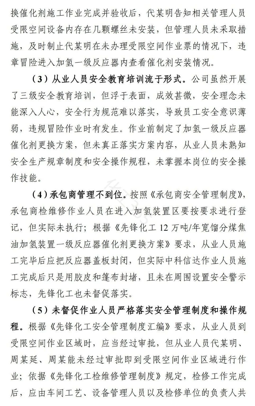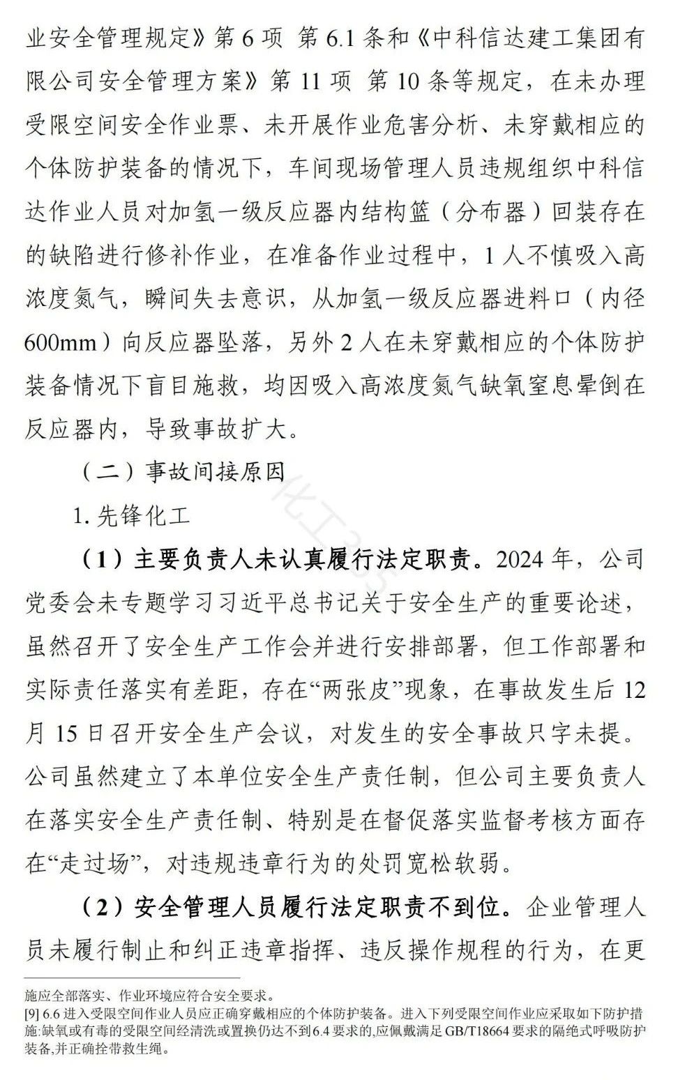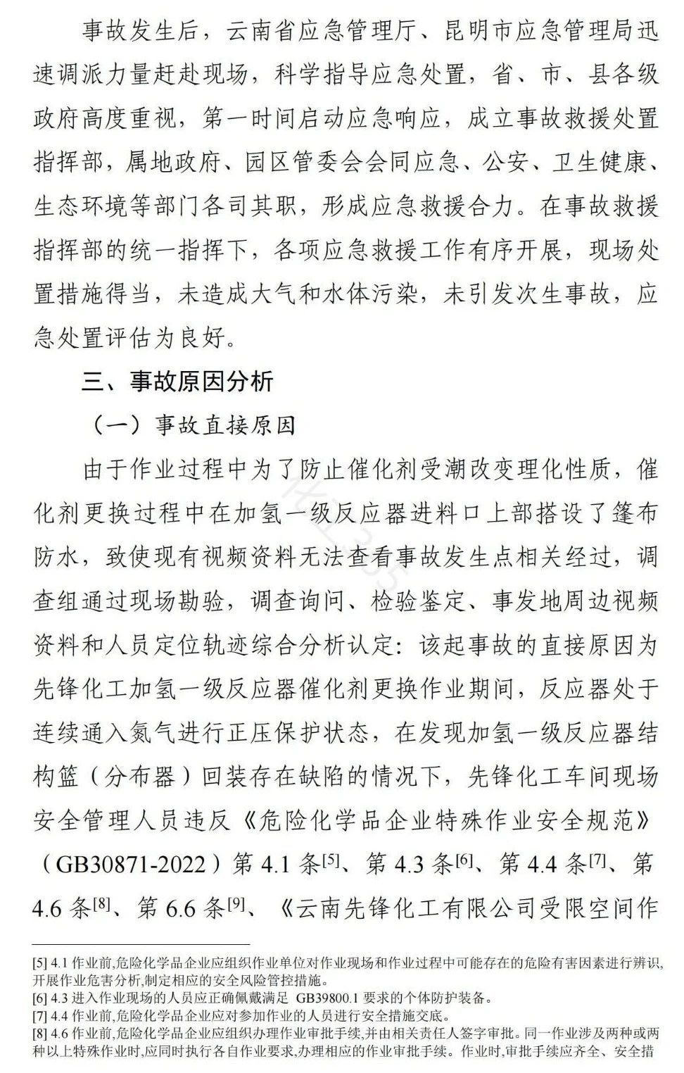 由于作业过程中为了防止催化剂受潮改变理化性质,催化剂更换过程中在加氢一级反应器进料口上部搭设了篷布防水,致使现有视频资料无法查看事故发生点相关经过,调查组通过现场勘验,调查询问、检验鉴定、事发地周边视频资料和人员定位轨迹综合分析认定:该起事故的直接原因为先锋化工加氢一级反应器催化剂更换作业期间,反应器处于连续通入氮气进行正压保护状态,在发现加氢一级反应器结构篮(分布器)回装存在缺陷的情况下,先锋化工车间现场安全管理人员违反《危险化学品企业特殊作业安全规范》(GB30871-2022)第 4.1 条[5]、第 4.3 条[6]、第 4.4 条[7]、第4.6 条[8]、第 6.6 条[9]、《云南先锋化工有限公司受限空间作业安全管理规定》第 6 项 第 6.1 条和《中科信达建工集团有限公司安全管理方案》第 11 项 第 10 条等规定,在未办理受限空间安全作业票、未开展作业危害分析、未穿戴相应的个体防护装备的情况下,车间现场管理人员违规组织中科信达作业人员对加氢一级反应器内结构篮(分布器)回装存在的缺陷进行修补作业,在准备作业过程中,1 人不慎吸入高浓度氮气,瞬间失去意识,从加氢一级反应器进料口(内径600mm)向反应器坠落,另外 2 人在未穿戴相应的个体防护装备情况下盲目施救,均因吸入高浓度氮气缺氧窒息晕倒在反应器内,导致事故扩大。