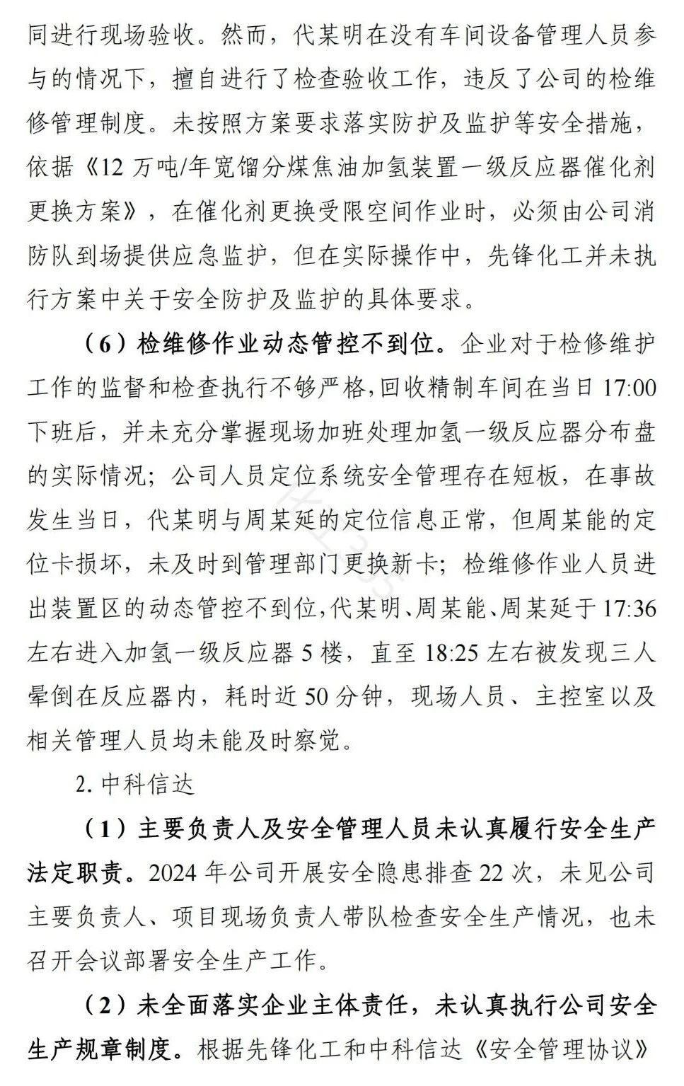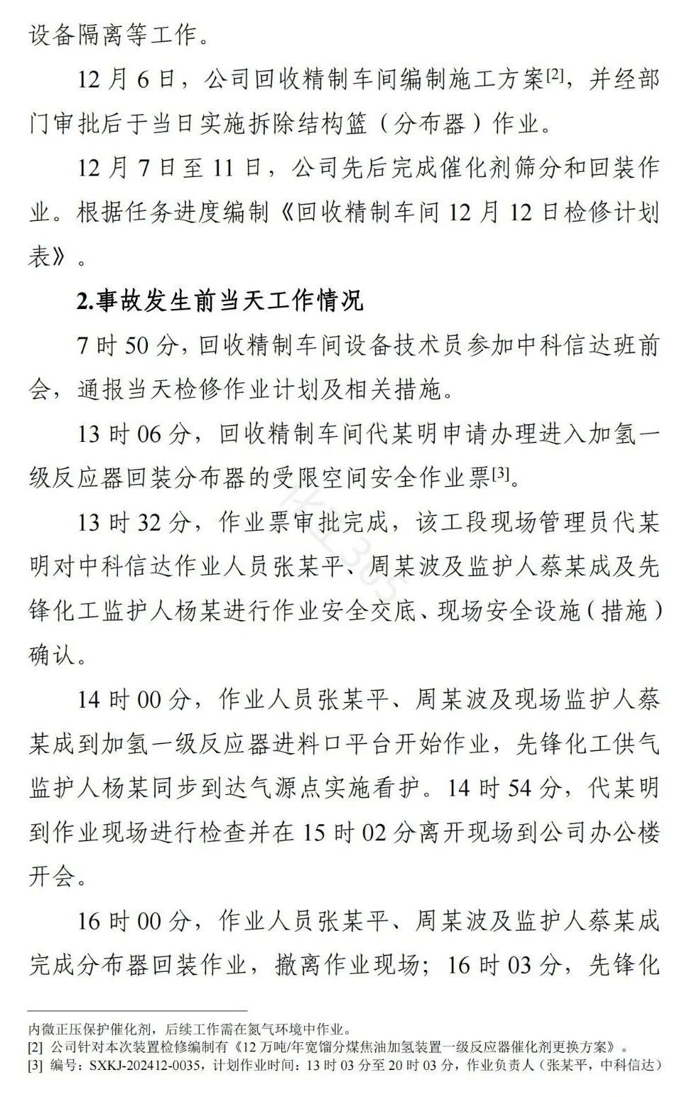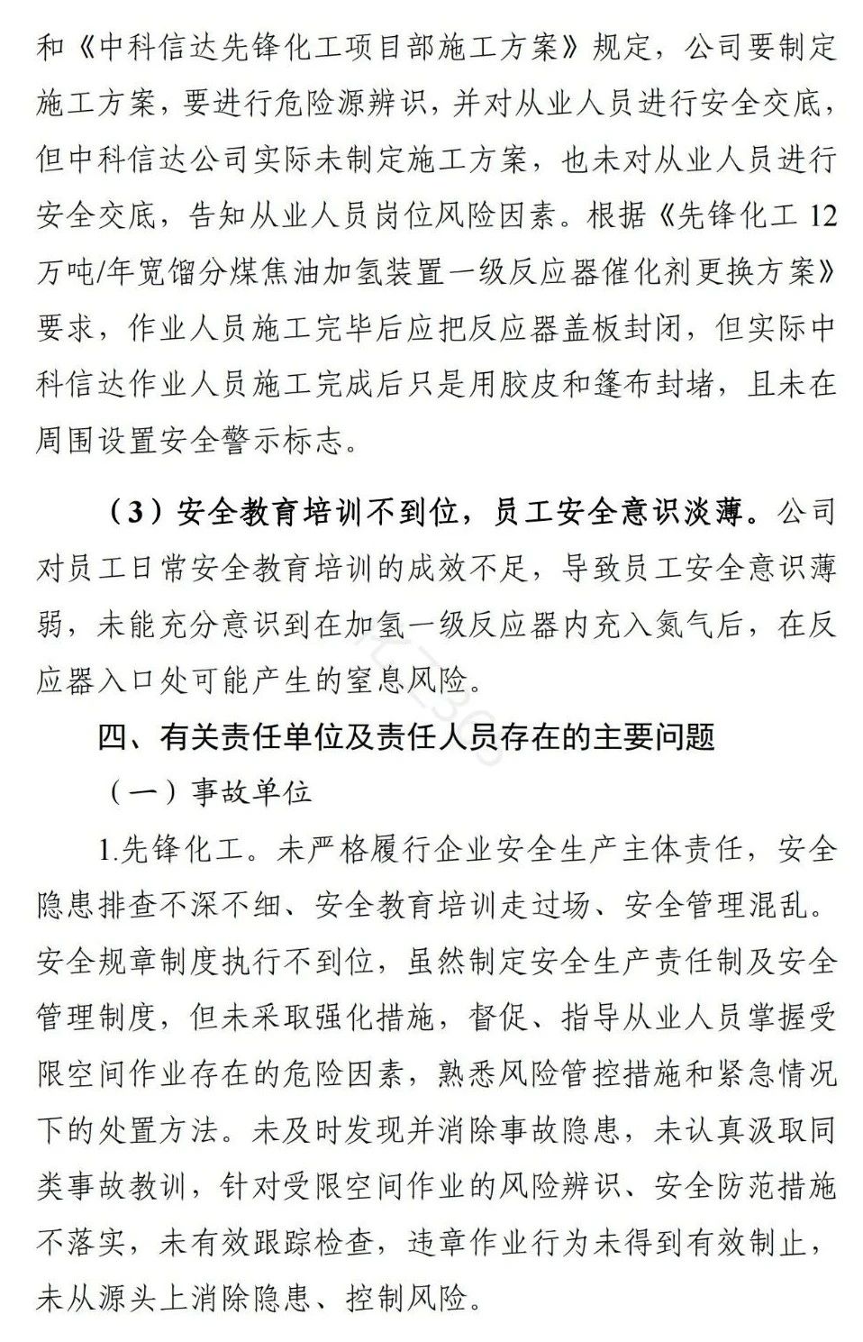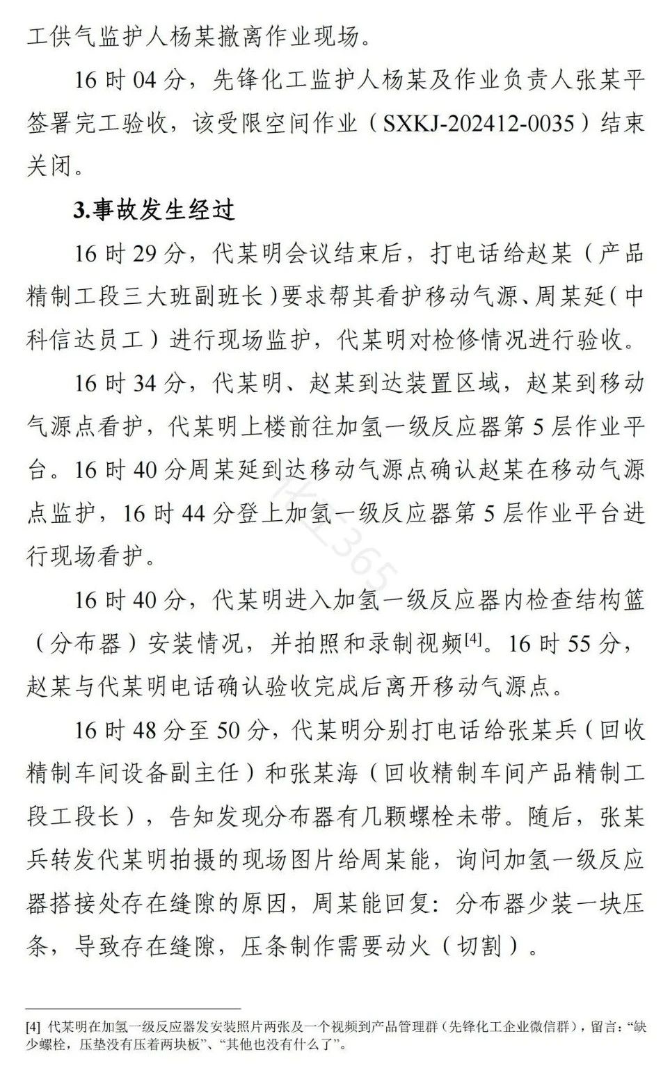 由于作业过程中为了防止催化剂受潮改变理化性质,催化剂更换过程中在加氢一级反应器进料口上部搭设了篷布防水,致使现有视频资料无法查看事故发生点相关经过,调查组通过现场勘验,调查询问、检验鉴定、事发地周边视频资料和人员定位轨迹综合分析认定:该起事故的直接原因为先锋化工加氢一级反应器催化剂更换作业期间,反应器处于连续通入氮气进行正压保护状态,在发现加氢一级反应器结构篮(分布器)回装存在缺陷的情况下,先锋化工车间现场安全管理人员违反《危险化学品企业特殊作业安全规范》(GB30871-2022)第 4.1 条[5]、第 4.3 条[6]、第 4.4 条[7]、第4.6 条[8]、第 6.6 条[9]、《云南先锋化工有限公司受限空间作业安全管理规定》第 6 项 第 6.1 条和《中科信达建工集团有限公司安全管理方案》第 11 项 第 10 条等规定,在未办理受限空间安全作业票、未开展作业危害分析、未穿戴相应的个体防护装备的情况下,车间现场管理人员违规组织中科信达作业人员对加氢一级反应器内结构篮(分布器)回装存在的缺陷进行修补作业,在准备作业过程中,1 人不慎吸入高浓度氮气,瞬间失去意识,从加氢一级反应器进料口(内径600mm)向反应器坠落,另外 2 人在未穿戴相应的个体防护装备情况下盲目施救,均因吸入高浓度氮气缺氧窒息晕倒在反应器内,导致事故扩大。
