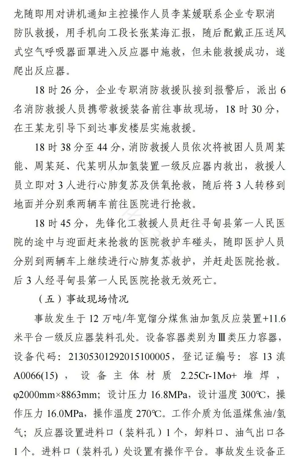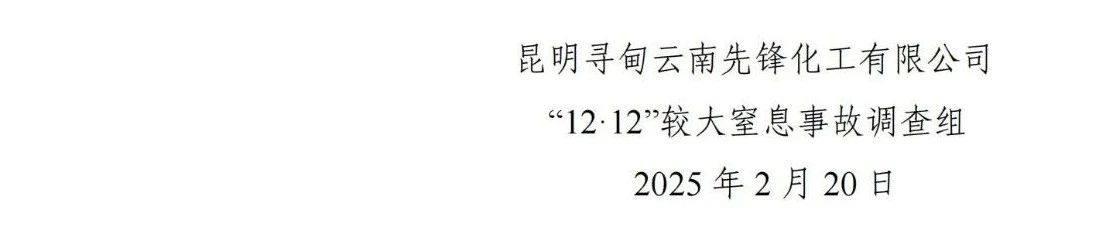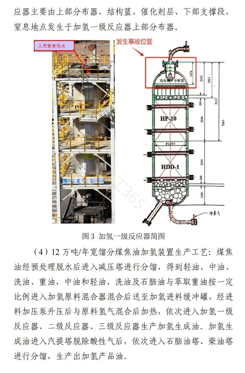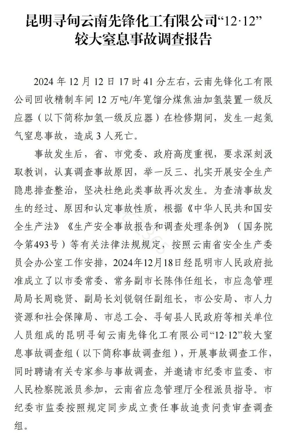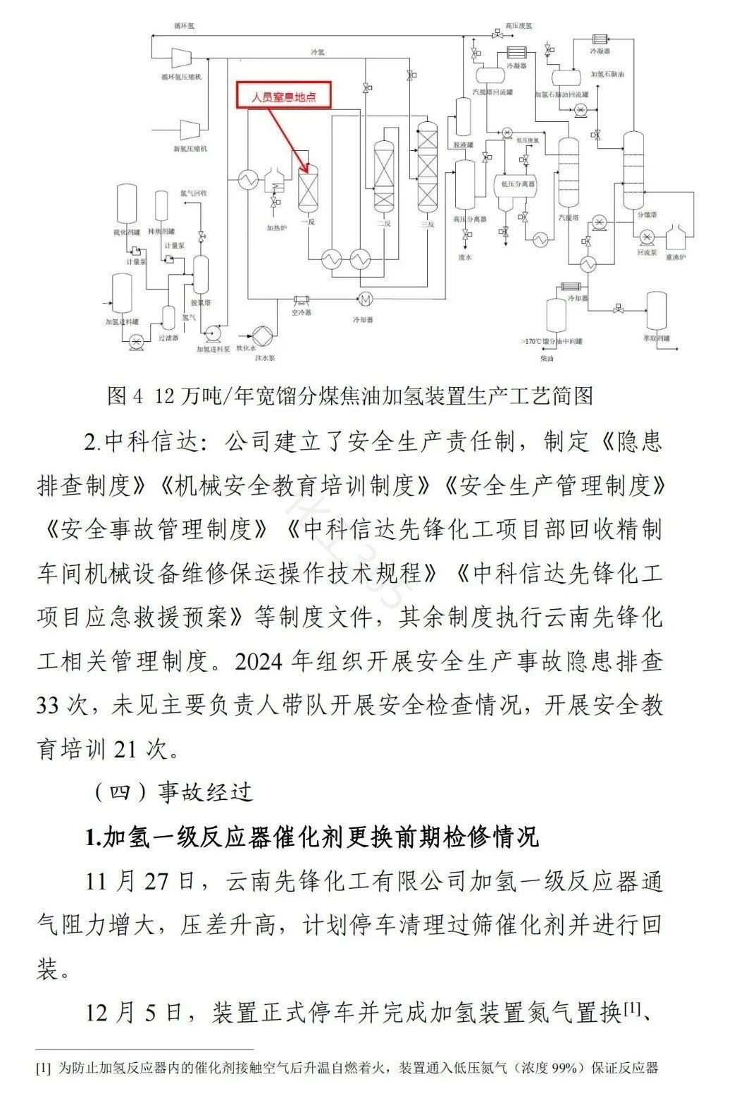2024 年 12 月 12 日 17 时 41 分左右,云南先锋化工有限公司回收精制车间 12 万吨/年宽馏分煤焦油加氢装置一级反应器(以下简称加氢一级反应器)在检修期间,发生一起氮气窒息事故,造成 3 人死亡。
