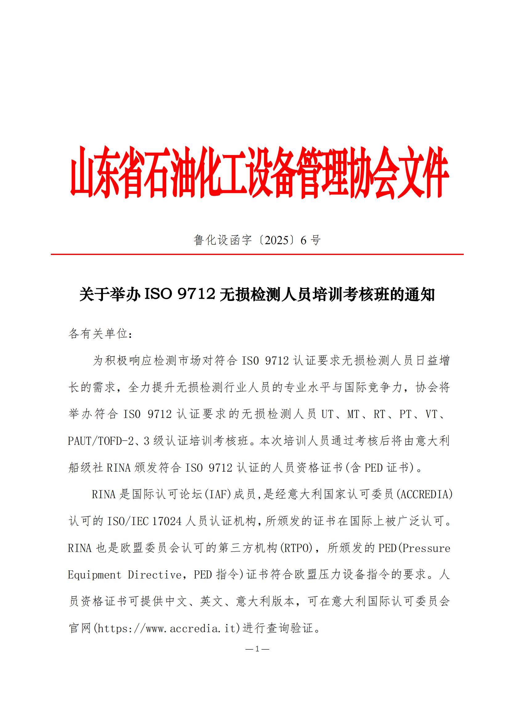关于举办 ISO 9712无损检测人员培训考核班的通知