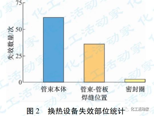 从图1可以看出,换热设备失效类型以局部腐蚀为主,腐蚀减薄和胀裂失效数量较少。受设备安装施工与生产工艺的影响,含水油气介质中的水容易积聚于换热设备底层或分程隔板处,导致其腐蚀环境更为苛刻,造成该处的管束及管束-管板焊缝位置腐蚀穿孔更为频繁(见图2)。