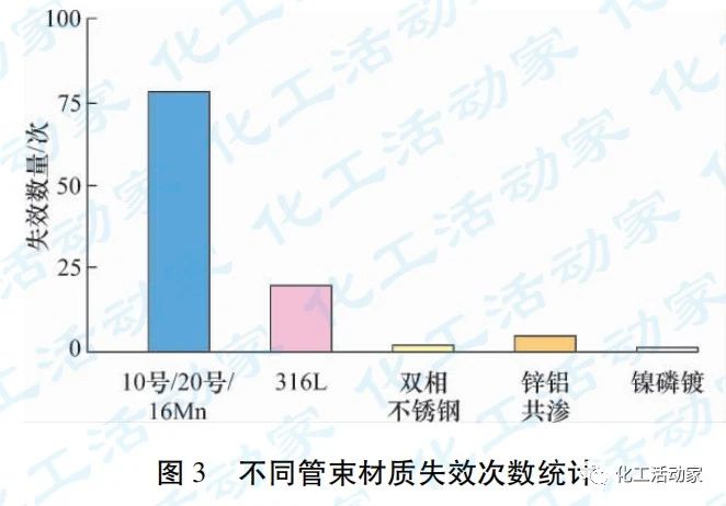 站内换热设备管程材质以10号、20号和16Mn为主,少数采用304,316L和2205,管板主要材质为16MnII,16MnIII和Q235R,部分管板堆焊不锈钢材质;壳程材质以Q345R和Q245R为主。由图3可见,换热设备的腐蚀失效与管束材质有关,10号、20号和16Mn等钢材腐蚀失效数量最多,其次为316L不锈钢。双相不锈钢、锌铝共渗及镍磷镀内防腐管束应用较少,但也有失效。