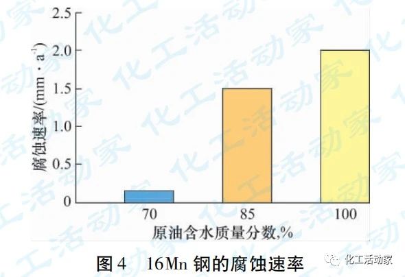 换热设备的腐蚀失效与服役介质密切相关。油气介质为未经脱水的原油和天然气,介质中含有一定量的油田采出水,采出水的腐蚀性较强,其矿化度和Cl-含量等普遍较高,pH值较低,并含有一定量的CO2和H2S酸性气体。在通常情况下,原油对金属的腐蚀性很弱,当原油含水率较低时,即使采出水矿化度高,其腐蚀性仍然较弱,但随着原油含水率的上升,其腐蚀性增强。当原油含水质量分数上升到85%及以上时,16Mn钢的腐蚀速率明显升高,试验结果见图4。
