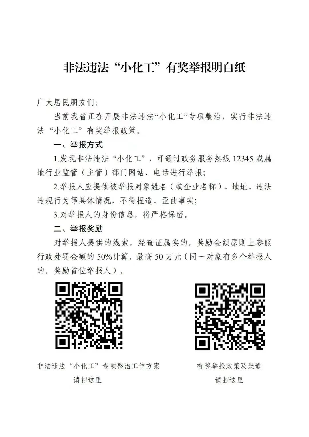 认真落实《全省非法违法“小化工”专项整治工作方案》和国家及省有关工作部署,鼓励、发动社会公众和企业从业人员积极举报非法违法“小化工”,近日,山东省政府安委会办公室编写了《非法违法“小化工”有奖举报明白纸》。