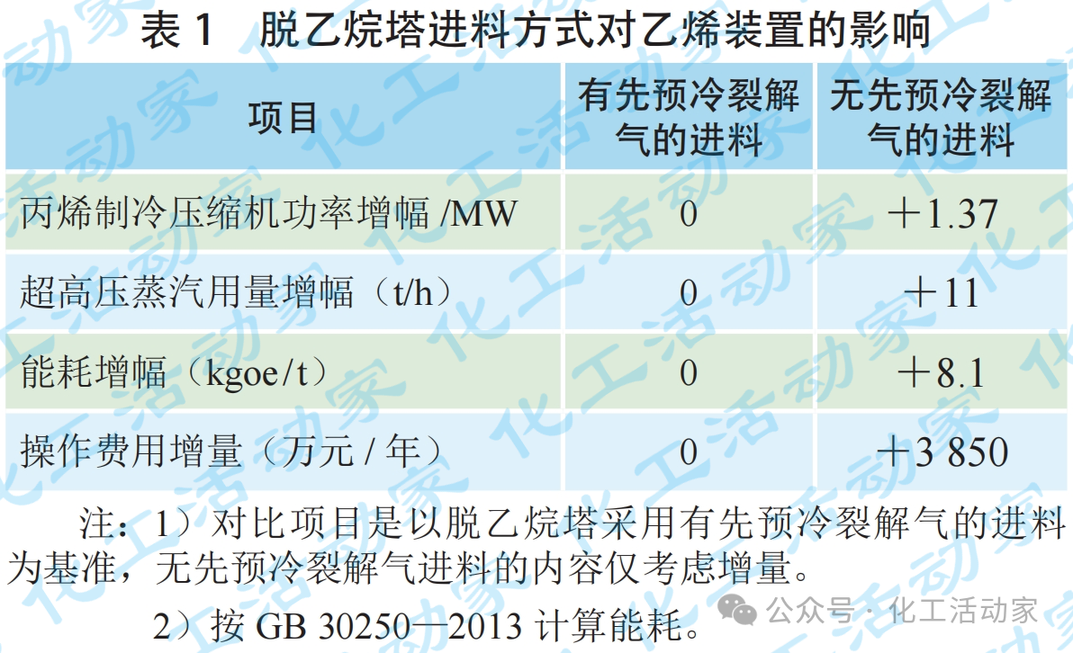 如果预脱甲烷塔釜的一部分出料不用来预冷裂解气,则裂解气预冷所缺少的冷量部分将由丙烯冷剂承担,造成丙烯制冷压缩机的功率增加1.37MW。由于丙烯制冷压缩机透平的驱动介质是超高压蒸汽,对应超高压蒸汽的用量约增加11t/h,能耗将增加8.1kgoe/t,同时造成了操作费用大幅增加。因此,当脱乙烷塔采用来自预脱甲烷塔釜的一股物料直接进料,另一股物料先预冷裂解气后再进料的方式,对乙烯装置的节能十分有利。